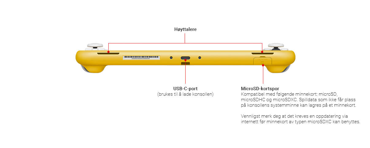 - MicroSD-kortsporKompatibel med microSD-, microSDHC- og microSDXC-minnekort.Merk: En systemoppdatering vil være påkrevd før minnekort av typen microSDXC kan benyttes.