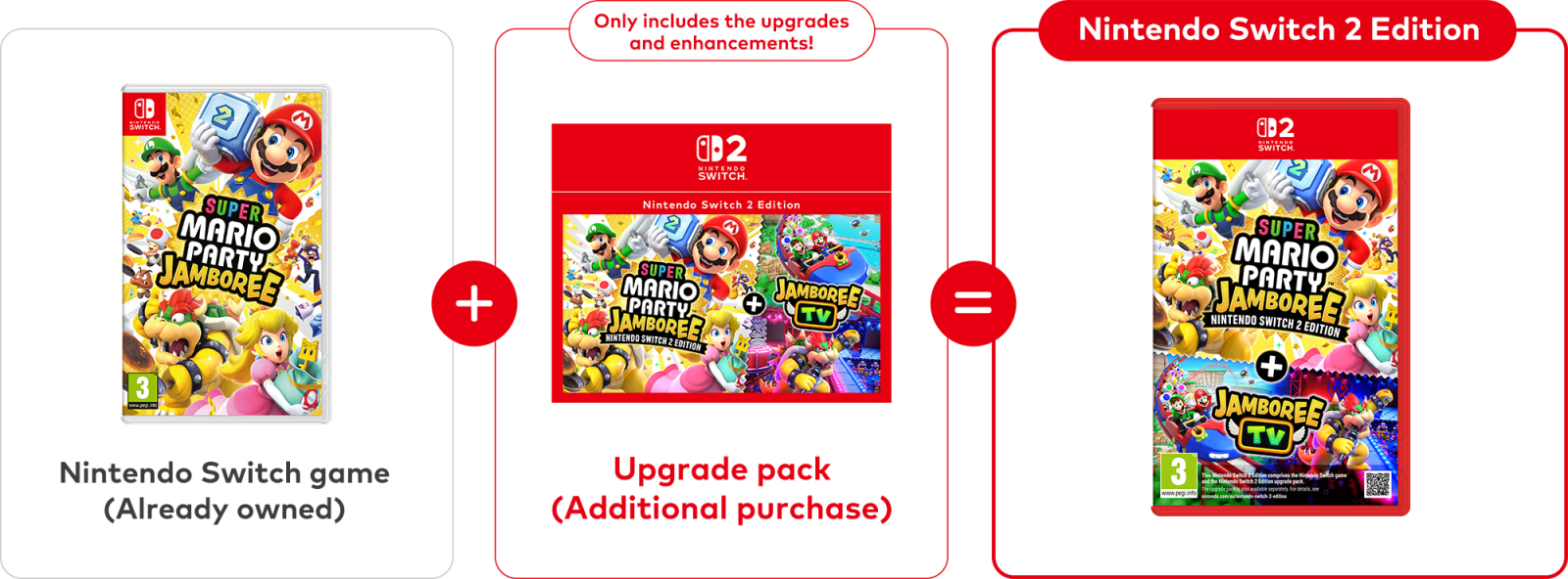Hvis du allerede eier Super Mario Party Jamboree til Nintendo Switch, trenger du kun å kjøpe oppgraderingspakken for å spille Nintendo Switch 2-utgaven.
