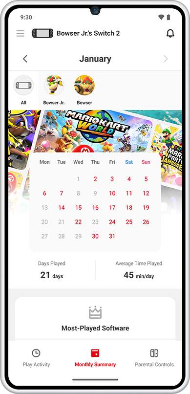 Som foreldre eller foresatte så er det ikke alltid like enkelt å følge med på hva barna holder på med. Med Nintendo Switch Parental Controls-appen for smartenheter kan du enkelt holde styr på hva barna spiller og gjør på Nintendo Switch 2- og Nintendo Switch-konsollen. Via appen kan du også sette restriksjoner for konsollbruken direkte.